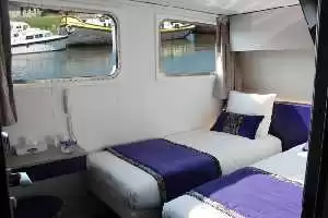 CroisiEurope . C'est une péniche à taille humaine comportant seulement trois ponts : le pont soleil, le pont principal et le pont inférieur. Mesurant 40 mètres de long pour 5,70 mètres de large, ce petit bateau est conçu pour naviguer sur la Loire, le plus long fleuve de France, mais peut aussi voguer sur le Rhin, le Main et la Moselle. Avec ses 11 cabines spacieuses et lumineuses, le MS Déborah peut embarquer jusqu'à 24 passagers sur la base d'une double occupation. Les cabines sont toutes extérieures, avec de larges fenêtres vous permettant d'apprécier la nature et les paysages qui défilent le long de la Loire. Au pont principal, entre le bar et le restaurant, une cabine est aménagée pour héberger des personnes à mobilité réduite. Toutes les cabines du MS Déborah assurent un confort d'exception, grâce à leurs commodités : un lit double ou deux lits bas, une télévision, une radio, un coffre-fort, une salle de bain avec une douche et un lavabo, et un sèche-cheveux. Chaque cabine est dotée d'une climatisation réglable individuellement. Reconnaissable à ses lignes extérieures épurées et à ses couleurs blanc et bleu foncé, le MS Déborah vous embarque à la découverte des villes au riche patrimoine, telles que au départ de Paris, Nevers - Marseilles-lès-Aubigny - La Chapelle-Montlinard -Ménétréol-sous-Sancerre - Lere - Briare Équipements et activités présents sur le navire Pour la joie des fins gourmets, la riche gastronomie française est à l'honneur sur le bateau de croisière MS Déborah de la compagnie CroisiEurope. Attablez-vous dans le spacieux restaurant aux tons mauves et blancs, situé sur le pont principal, au centre de ce bateau. Des grands chefs français s'activent à bord pour vous concocter de délicieuses spécialités locales et régionales qui sont servies avec des vins de qualité sélectionnés par Serge Dubs, un des meilleurs sommeliers. Les grandes fenêtres vitrées du restaurant vous permettent d'apprécier la vue sur le rivage. Sur le pont principal, retrouvez également un élégant bar où vous pouvez vous détendre tout en sirotant votre boisson préférée : champagne, chocolat chaud, liqueur, etc. À côté de ce bar, le grand salon avec des fauteuils et des canapés douillets vous accueille aussi pour vos moments de relaxation, un livre ou encore un cocktail à la main, tout en contemplant la beauté sauvage des paysages côtiers de la Loire. En allant vers l'avant du bateau, sur le pont principal, découvrez une vaste terrasse équipée d'un barbecue et d'un bain à remous installé à la proue. Sur le pont soleil, un grand solarium vous attend pour profiter du soleil et de belles vues d'ensemble sur le fleuve, les villages riverains et la nature. Retrouvez sur cet espace commun extérieur des transats confortables et des parasols. En plus des installations de détente à bord du MS Déborah, des vélos sont mis à la disposition des passagers pour satisfaire leurs envies de balades lors des escales et d'explorer autrement les sites d’intérêt des villes visitées. Tout au long des croisières fluviales sur cette péniche moderne, les six membres d'équipage attentionnés de la compagnie CroisiEurope sont prêts à vous donner les renseignements sur les villes d'escales ou toutes autres informations dont vous auriez besoin