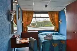 Sitôt réveillé, chaque passager peut admirer le paysage extérieur depuis la grande fenêtre de sa chambre. Question mobilière, la chambre compte un lit double ou deux lits simples, un espace de rangement et un téléviseur satellite. La salle de bains privative est équipée d’une douche, d'un WC et d’un sèche-cheveux. Des serviettes de toilettes sont mises à disposition. Point pratique : des prises électriques en 220 V permettent de recharger ou d'utiliser de petits appareils électriques. Si vos appareils fonctionnent sur une tension électrique différente, n’oubliez pas d’apporter un adaptateur.