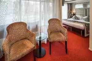 Les cabines de l'AmaCerto sont spacieuses et confortables, avec des choix de catégories allant des cabines standard aux suites avec balcons jumeaux (français et extérieur), offrant une vue imprenable. Les chambres sont dotées d'équipements modernes, dont une télévision à la demande, une connexion Wi-Fi gratuite et des bouteilles d'eau renouvelées chaque jour. Les salles de bains élégantes, équipées de douches multi-jets, renforcent l'expérience de confort pour les passagers.