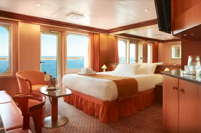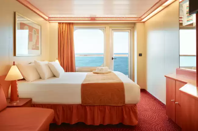 Cabine avec balcon pourvue d'un lit double ou de 2 lits simples (sur demande). Dispose d'une salle de bain avec douche, d'un sèche-cheveux, d'une télévision interactive, d'un coffre-fort et de la climatisation (thermostat réglable). Connexion internet Wi-Fi disponible en supplément. Surface de 13 m². Les cabines de cette catégorie sont localisées du pont 8 au pont 10 au milieu du bateau. La taille, l'agencement et le mobilier peuvent varier et différer de l'illustration (au sein de la même catégorie de cabine). La photo ci-contre n'est pas contractuelle.