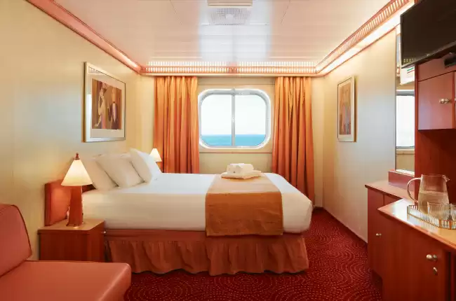 Cabine simple avec vue mer pourvue d'un lit double ou de 2 lits simples (sur demande). Dispose d'une salle de bain avec douche, d'un sèche-cheveux, d'une télévision interactive, d'un coffre-fort et de la climatisation (thermostat réglable). Service de chambre payant 24/24h. Connexion internet Wi-Fi disponible en supplément. Les cabines de cette catégorie sont localisées aux ponts 1 et 2 en poupe et en proue du bateau. La taille, l’agencement et le mobilier peuvent varier et différer de l’illustration (au sein de la même catégorie de cabine). La photo ci-contre n'est pas contractuelle.