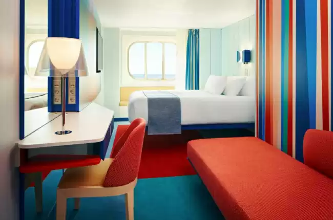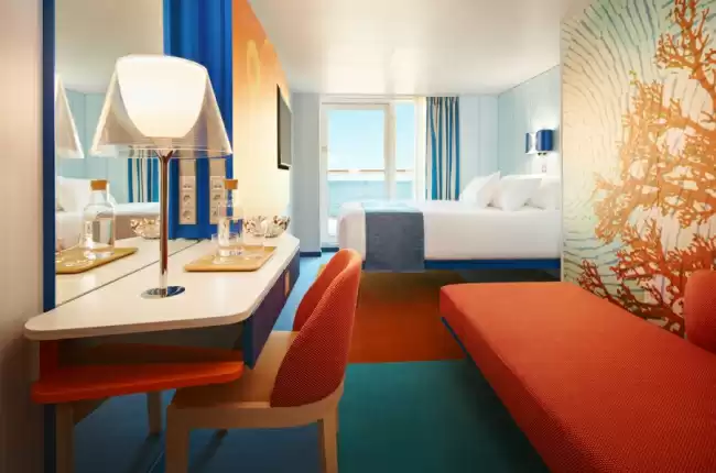 Cabine avec vue mer pourvue d'un lit double ou de 2 lits simples (sur demande). Dispose d'une salle de bain avec douche, d'un sèche-cheveux, d'une télévision interactive, d'un coffre-fort et de la climatisation (thermostat réglable). Service de chambre payant 24/24h. Connexion internet Wi-Fi disponible en supplément. Surface de 17 m². Les cabines de cette catégorie sont localisées aux ponts 4 et 5 au milieu du bateau. La taille, l'agencement et le mobilier peuvent varier et différer de l'illustration (au sein de la même catégorie de cabine). La photo ci-contre n'est pas contractuelle.