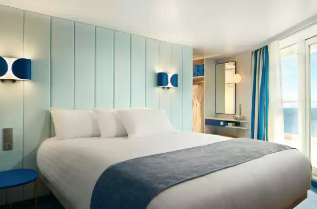 Cabine dotée d'une grande terrasse, pourvue d'un lit double ou de 2 lits simples (sur demande). Dispose d'une salle de bain avec douche, d'un sèche-cheveux, d'une télévision interactive, d'un coffre-fort et de la climatisation (thermostat réglable). Service de chambre payant 24/24h. Connexion internet Wi-Fi disponible en supplément. Surface de 14 m². Les cabines de cette catégorie sont localisées au pont 9 au milieu du bateau. La taille, l'agencement et le mobilier peuvent varier et différer de l'illustration (au sein de la même catégorie de cabine). La photo ci-contre n'est pas contractuelle.
