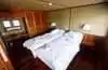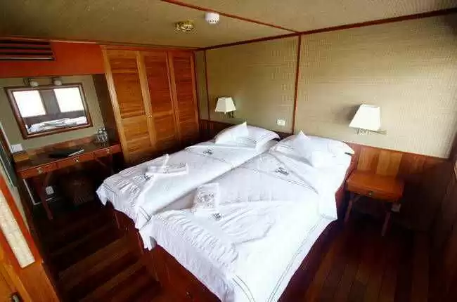 Le bâtiment possède 24 cabines extérieures réparties sur deux ponts : 14 chambres sur le pont principal et 10 chambres sur le pont supérieur. Chaleureuses et élégamment décorées de bois exotique, elles offrent aux croisiéristes tout le raffinement de l’Asie et tous les équipements de confort nécessaires à une croisière d’excellence. Chacune est munie d’une coiffeuse, d’une climatisation et d’un coffre-fort. Information utile : un service de blanchisserie est disponible sur le navire.