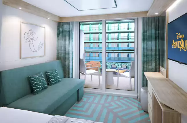 Cabines équipées d'un balcon privatif, inspirées par l’univers Disney dotées d'une salle de bain avec douche.