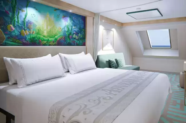 Cabines avec vue mer inspirées par l’univers Disney avec coin bureau et TV, salle de bain avec douche.