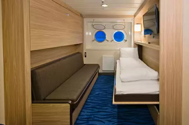 Les 220 cabines se partagent l'espace sur les différents niveaux. Les chambres intérieures se situent dans les étages inférieurs. Plus on monte, plus les espaces de couchage sont grands et bien équipés. Le must sont les suites aux pont 5 et 6. On y retrouve la classe nordique dans des tons boisés et dorés ainsi que des vues lumineuses et panoramiques pour les plus belles chambres afin de profiter à tout moment du spectacle de la nature. Les équipements modernes sont de mise tels le téléphone, la TV écran plat, le minibar, salle d bain et WC privatifs et des lits de bonne facture. Meilleure est la chambre, meilleurs sont les services et accessoires : un espace salon, un sofa qui se transforme en couchette par exemple.