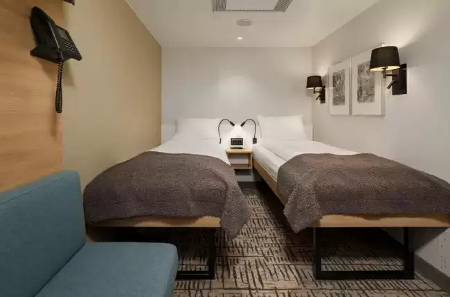 On retrouve cette ambiance sobre et chaleureuse dans les 237 cabines dont 207 sont avec vue extérieure pour une immersion totale. Les équipements modernes sont présents dans chaque chambre (TV écran plat, téléphone, literie qualitative, salle de bain et WC privatifs). Au fil de la montée en gamme (intérieur, extérieur, mini suite et suite exploration), les services accessibles et prestations des lieux de couchage augmentent.