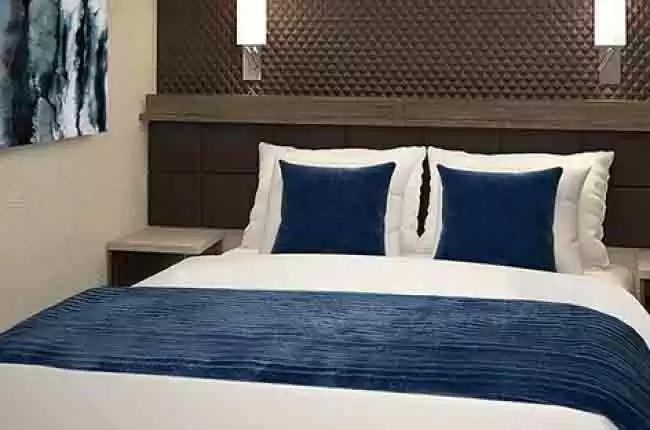 Equipement : Lit Queen-size (pouvant être séparé), matelas à plateau-coussin, tête de lit en cuir châtaigne rembourrée et tuftée pour rendre la lecture et la position assise dans le lit plus confortables, meuble-lavabo intégré, placard complet avec portes coulissantes, coin encastré sous la télévision 26 pouces, canapé-lit, évier double avec deux robinets, dosseret en mosaïque de verre et rangement sous l'évier, douche en cascade avec jets multiples et pommeau de douche à main, coffre-fort, réfrigérateur, sèche-cheveux.