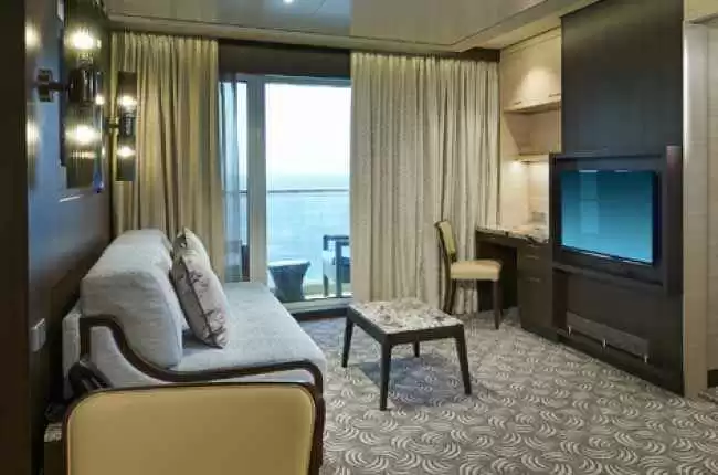 Avantages de la cabine : Service de majordome, service de conciergerie, enregistrement prioritaire, débarquement prioritaire, embarquement prioritaire, fruits frais, champagne de bienvenue, peignoirs en coton épais, menu d'oreillers, machine à espresso et à cappuccino, menus spéciaux pour les suites, matelas à plateau d'oreiller de la collection Bliss, friandises livrées à domicile tous les soirs.