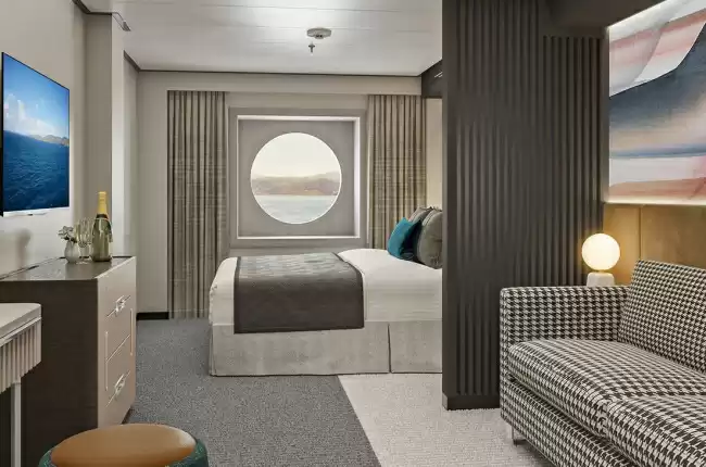 Equipement : Deux lits inférieurs convertibles en lits queen, les cabines familiales avec vue sur l'océan disposent d'un canapé-lit double, d'une télévision à écran plat, d'un coffre-fort, d'un sèche-cheveux, d'un bureau avec chaise, d'un placard, d'étagères, d'une salle de bain avec douche à porte coulissante en verre.