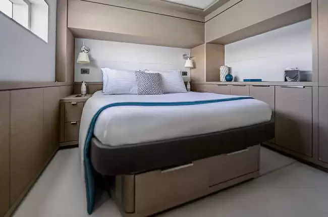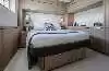 Equipements : cabine vue mer au milieu dotée d'un lit double, de deux tables de chevet, d'une penderie, d'un bureau avec abattant, d'une chaise en cuir, d'une salle de bain avec douche et WC.