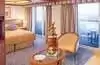 Avantages suite : mobilier de balcon haut de gamme, mini-bar, accès prioritaire à l'embarquement et au débarquement, service de blanchisserie et de nettoyage à sec gratuit, accès au Lotus Spa Thermal Suite, petit-déjeuner exclusif au restaurant Sabatini's, service de conciergerie dédié, réservation prioritaire pour les restaurants de spécialités et les excursions, cadeaux de bienvenue du chef, fleurs fraîches dans la suite, peignoirs en coton épais, menu d'oreillers, produits de bain haut de gamme, accès à un salon privé en fin de croisière.