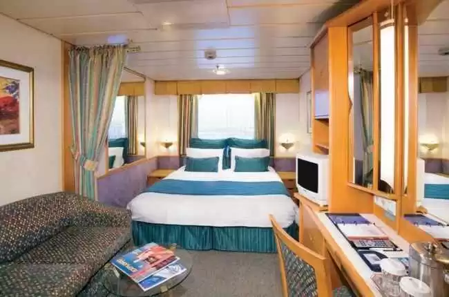 Equipement : Cabine intérieure équipée de deux lits jumeaux convertibles en un grand lit et deux lits couchette placés en hauteur et salle de bain, coiffeuse, sèche-cheveux, radio, télévision, téléphone et coin salon doté d'un canapé