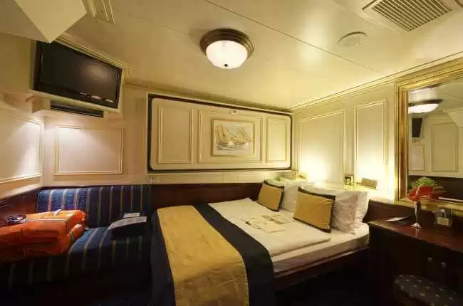 Les cabines extérieures sont équipées d'une salle de bain privée, un sèche-cheveux, un coffre-fort, une télévision avec lecteur DVD, un téléphone, une petite fenêtre (ou hublot) et beaucoup d'autres installations pour vous proposer le meilleur voyage possible. La taille, l'agencement et le mobilier peuvent varier et différer de l'illustration (au sein de la même catégorie de cabine).
