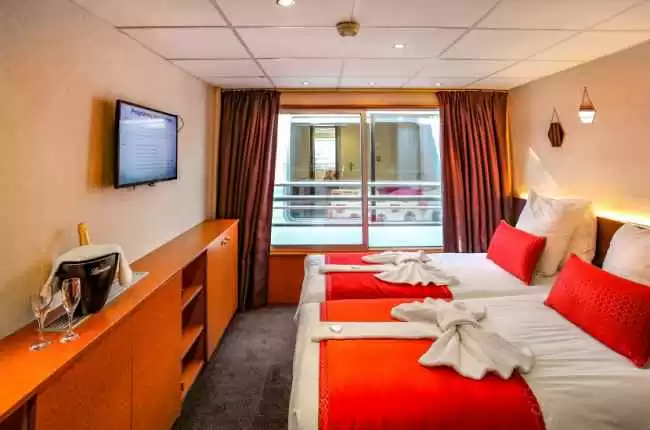 Toutes nos cabines sont situees au-dessus du niveau de le eau et offrent une vue panoramique (fenetres fixes) sur les paysages. Spacieuses et confortables elles disposent de deux lits ou d un grand lit- avec cabinet de toilette (douche WC et lavabo avec serviettes de toilette fournies a bord mais pas de gants de toilette). Electricite220 V. elles sont egalement equipees de television satellite - radio - seche-cheveux et coffre-fort. Certaines bateaux disposent de cabines amenagees pour handicapes (moteur) - nous consulter.Quel que soit le pont les cabine offrent les memes equipements et sont de meme grandeur (de 11 a 15 m²).